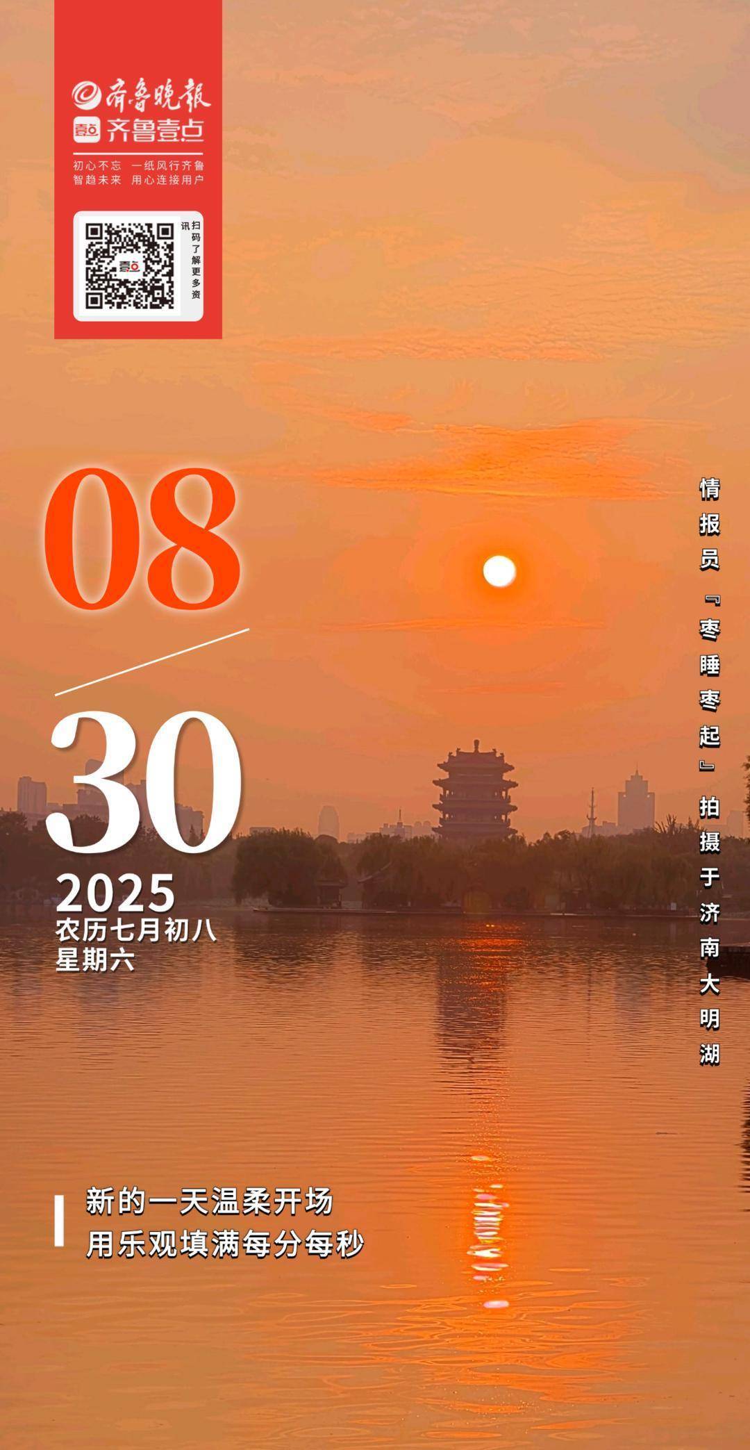 29日清晨,济南大明湖畔,太阳自东方缓缓升起,将天边染成绚烂橙黄。湖面波光潋滟,与天际相融,水天一色间,美轮美奂之景跃然眼前,宛如一幅动人的画卷,令人心旷神怡。